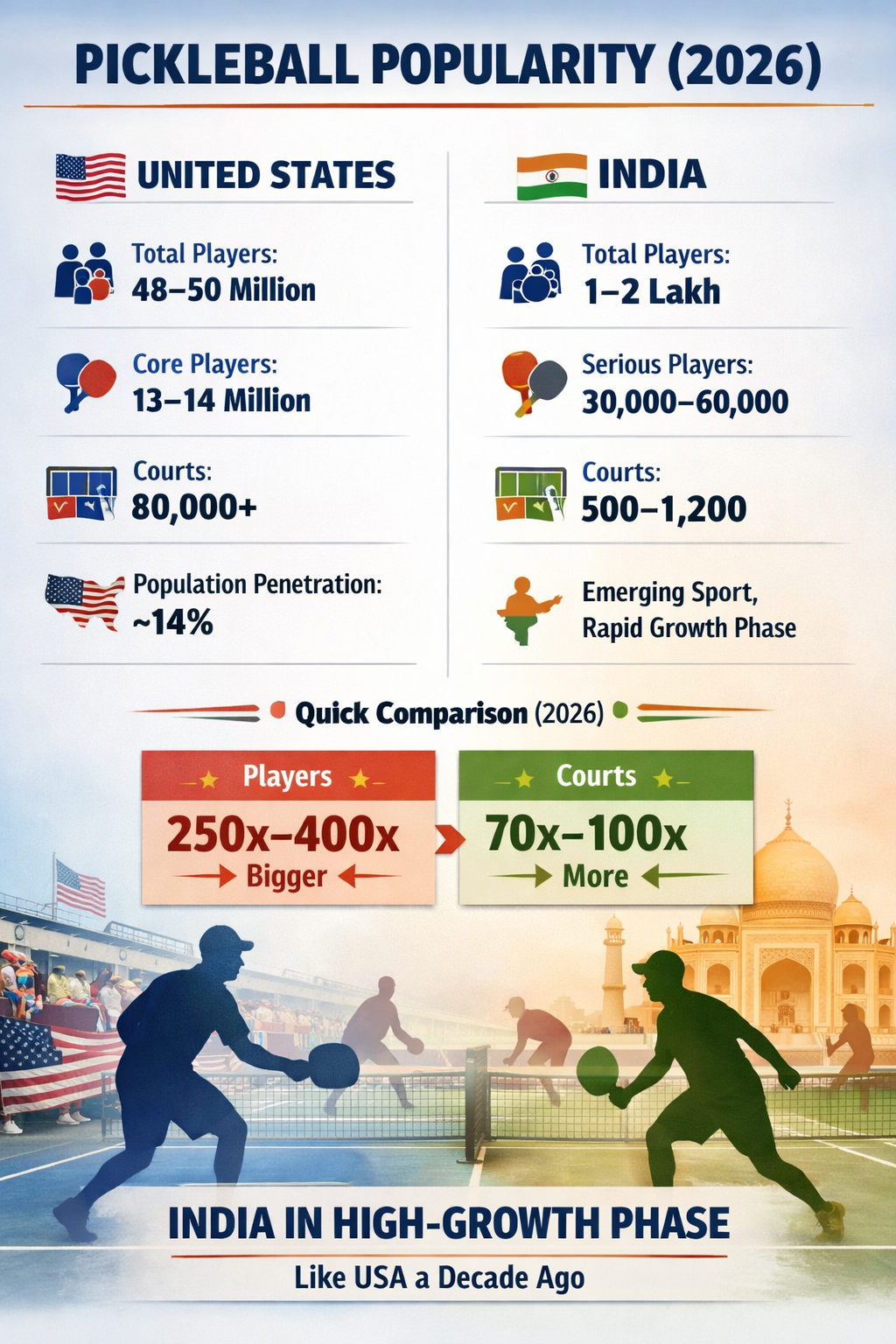 The comparison between the United States and India in 2026 is not just about numbers—it is about timing and potential. While the US showcases what a fully developed Pickleball ecosystem looks like, India offers a glimpse into the future of the sport.
