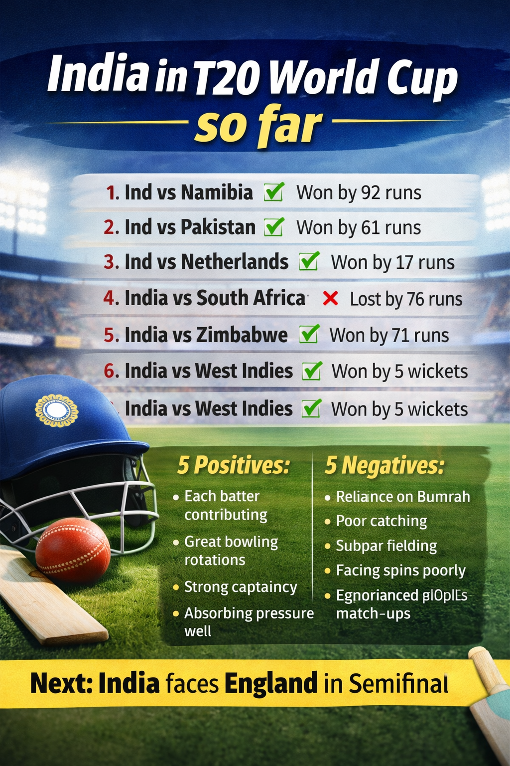 In hindsight, India hasn’t consistently played flawless cricket in this tournament. There have been phases of batting stagnation, moments of bowling indiscipline, and noticeable lapses in fielding intensity. Yet, they have still managed to secure a semifinal berth.