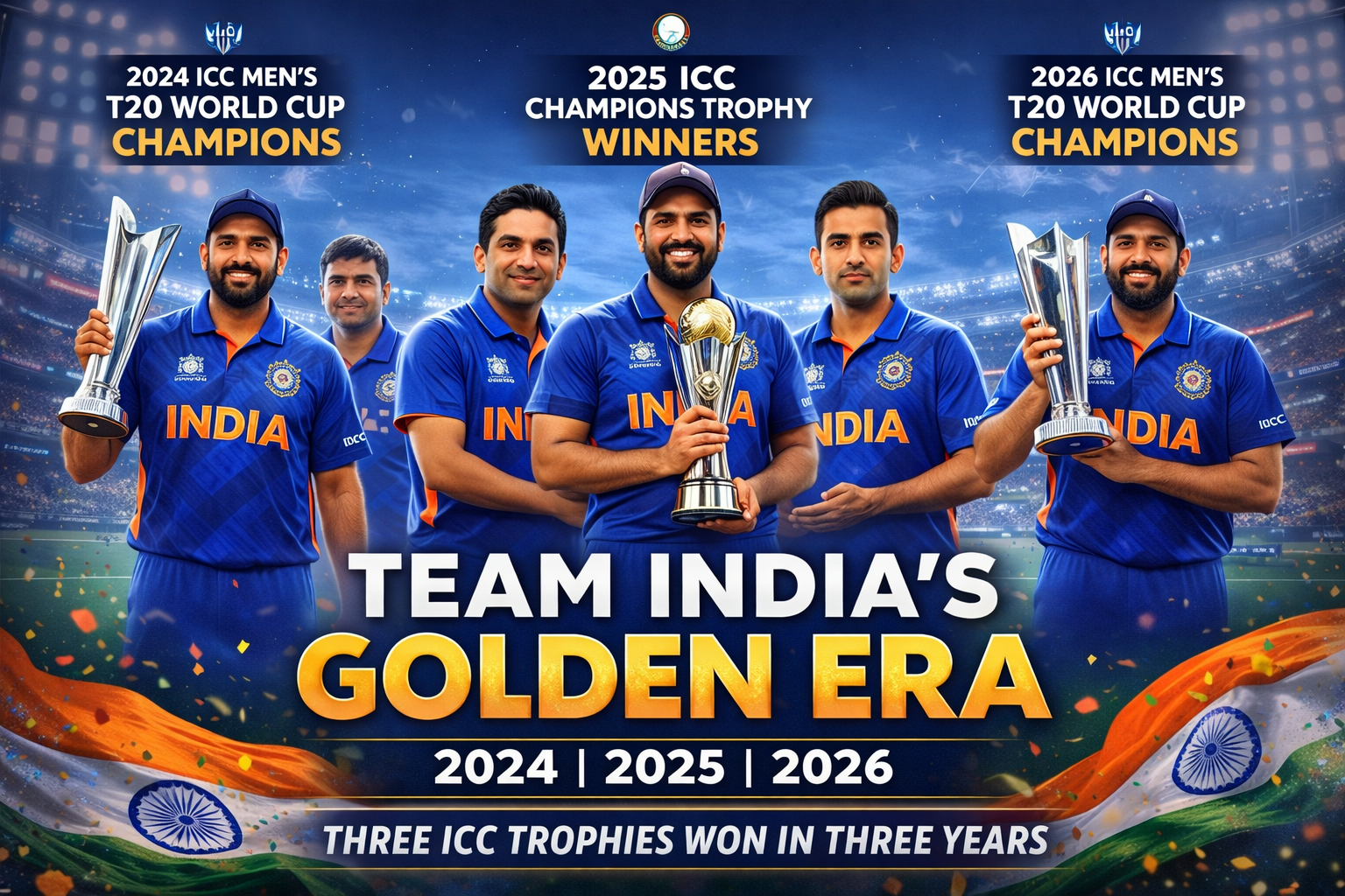 Winning three major tournaments within a short span is no ordinary achievement. From the undefeated run in the 2024 T20 World Cup to the Champions Trophy triumph in 2025 and the dramatic comeback in the 2026 T20 World Cup, Team India has written a golden chapter in its cricketing history.